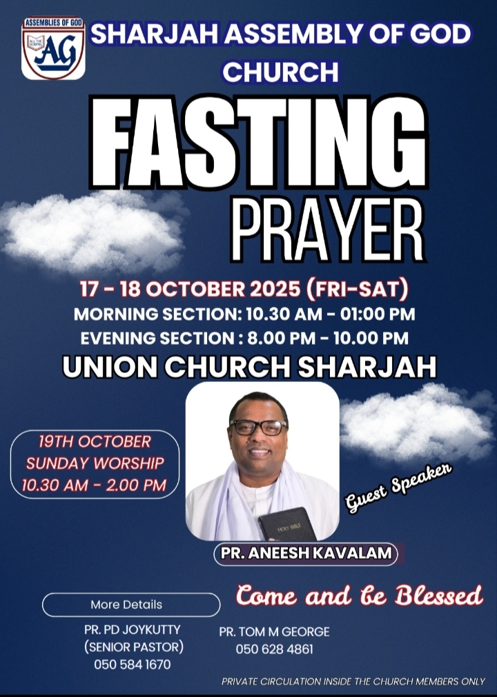 ഷാർജാ : അസംബ്ലീസ് ഓഫ് ഗോഡ് സഭയുടെ നേതൃത്വത്തിൽ ഷാർജ യൂണിയൻ ചർച്ചിൽ വച്ച് ഒക്ടോബർ 17 വെള്ളിയാഴ്ച മുതൽ 19 ഞായറാഴ്ച വരെ ഉപവാസ പ്രാർത്ഥനയും ആരാധനയും നടക്കും. 17, 18 ദിവസങ്ങളിൽ രാവിലെ 10 : 30 മുതൽ 1 മണിവരെ ഹാൾ നമ്പർ മൂന്നിലും, വൈകുന്നേരം 8 മണി മുതൽ 10 മണി വരെ ഹാൾ നമ്പർ പത്തിലും മീറ്റിങ്ങുകൾ നടത്തപ്പെടും. 19ന് ഞായറാഴ്ച രാവിലെ 10 : 30 മുതൽ 2 മണിവരെ വിശുദ്ധ സഭായോഗവും നടക്കും. പ്രസ്തുത മീറ്റിങ്ങുകളിൽ പാസ്റ്റർ അനീഷ് കാവാലം തിരുവചനത്തിൽ നിന്നും ശുശ്രൂഷിക്കും. പാസ്റ്റർ പി. ഡി. ജോയിക്കുട്ടി, പാസ്റ്റർ റ്റോം എം ജോർജ് തുടങ്ങിയവർ നേതൃത്വം നൽകും. കൂടാതെ പതിനാറാം തീയതി ( വ്യാഴാഴ്ച) വൈകിട്ട് 7 മണി മുതൽ 9 : 30 വരെ അലൈനിലും, പത്തൊമ്പതാം തീയതി ഞായറാഴ്ച വൈകിട്ട് 7 മണി മുതൽ 9 : 30 വരെ റാസൽഖൈമയിൽ ചർച്ച് സെന്റർ നക്കീലിലും പാസ്റ്റർ അനീഷ് കാവാലം ശുശ്രൂഷിക്കും.