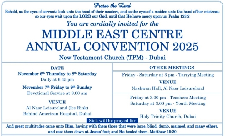 വ്യാഴം, വെള്ളി, ശനി ദിവസങ്ങളിൽ വൈകിട്ട് 6.45 ന് സുവിശേഷ പ്രസംഗവും വെള്ളി, ശനി ദിവസങ്ങളിൽ രാവിലെ 9 ന് പൊതുയോഗവും ഞായറാഴ്ച രാവിലെ 9 ന് മിഡിൽ ഈസ്റ്റ് സഭകളുടെ സംയുക്ത വിശുദ്ധ സഭായോഗവും ദുബായ് അമേരിക്കൻ ഹോസ്പിറ്റലിന് സമീപമുള്ള അൽ നാസർ ലെയ്സർലാൻഡിൽ (ഐസ് റിങ്ക്) നടക്കും.