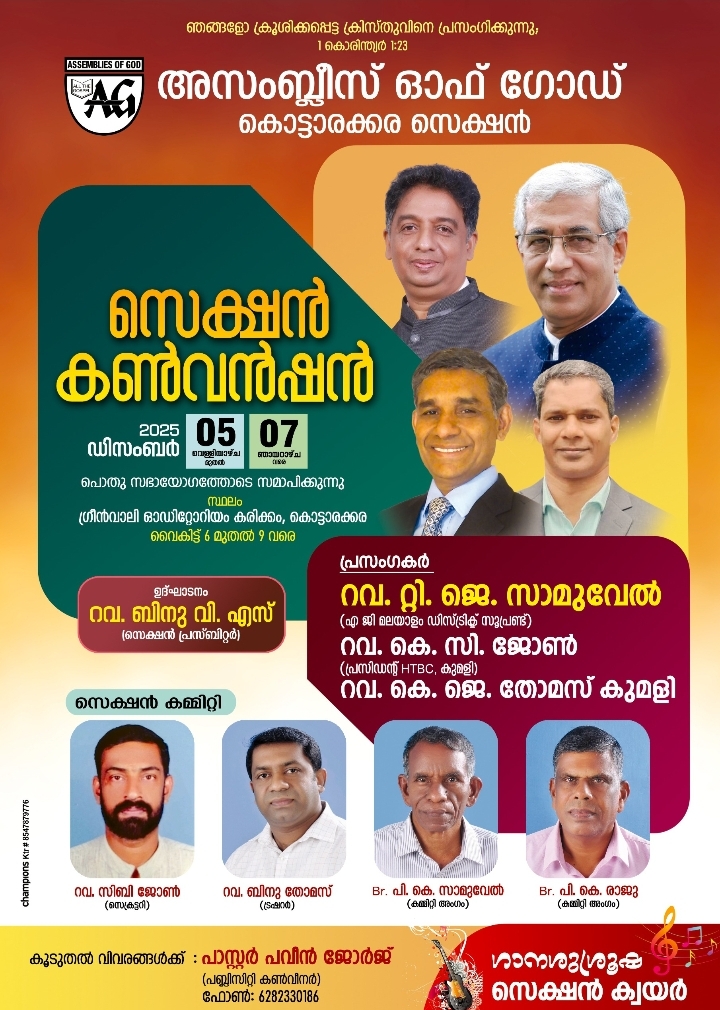 കൊട്ടാരക്കര: എജി കൊട്ടാരക്കര സെക്ഷന്റെ ആഭിമുഖ്യത്തിൽ ഡിസംബർ 5 മുതൽ 7 വരെ കൊട്ടാരക്കര കരിക്കം ഗ്രീൻ വാലി ഓഡിറ്റോറിയത്തിൽ സെക്ഷൻ കൺവെൻഷൻ നടക്കും. സെക്ഷൻ പ്രസ്ബിറ്റർ. റവ. ബിനു വി. എസ്. ഉദ്ഘാടനം ചെയ്യുന്ന കൺവെൻഷനിൽ റവ. ടി. ജെ. സാമുവൽ പുനലൂർ, റവ. കെ. സി. ജോൺ. വെൺമണി., റവ. കെ. ജെ. തോമസ്. കുമളി എന്നിവർ പ്രസംഗിക്കും.